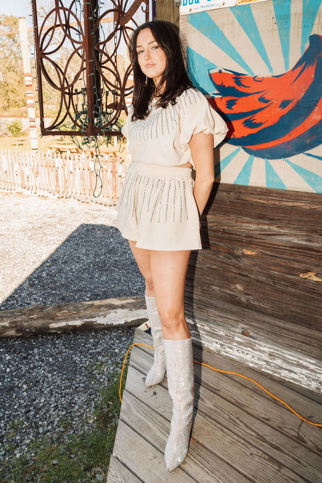Queen Of Sparkles Beige Rhinestone Burst Bubble Top Spring 2022