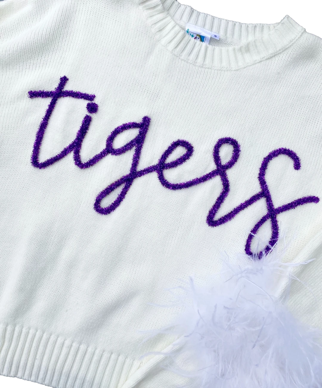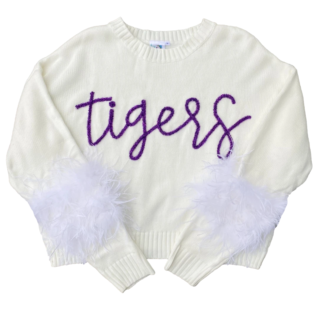 Queen Of Sparkles Gameday Purple“Tigers” Feather Sleeve Sweater