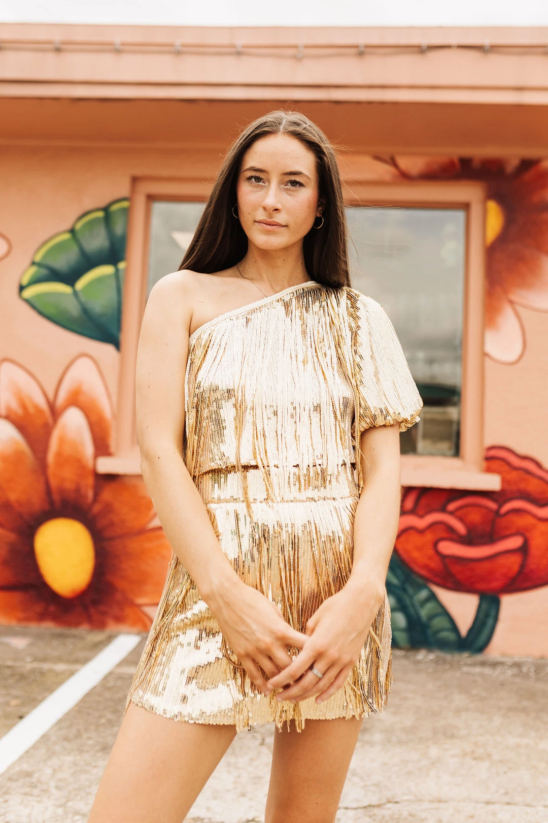 Queen Of Sparkles Gold Fringe One Shoulder Top Spring 2022