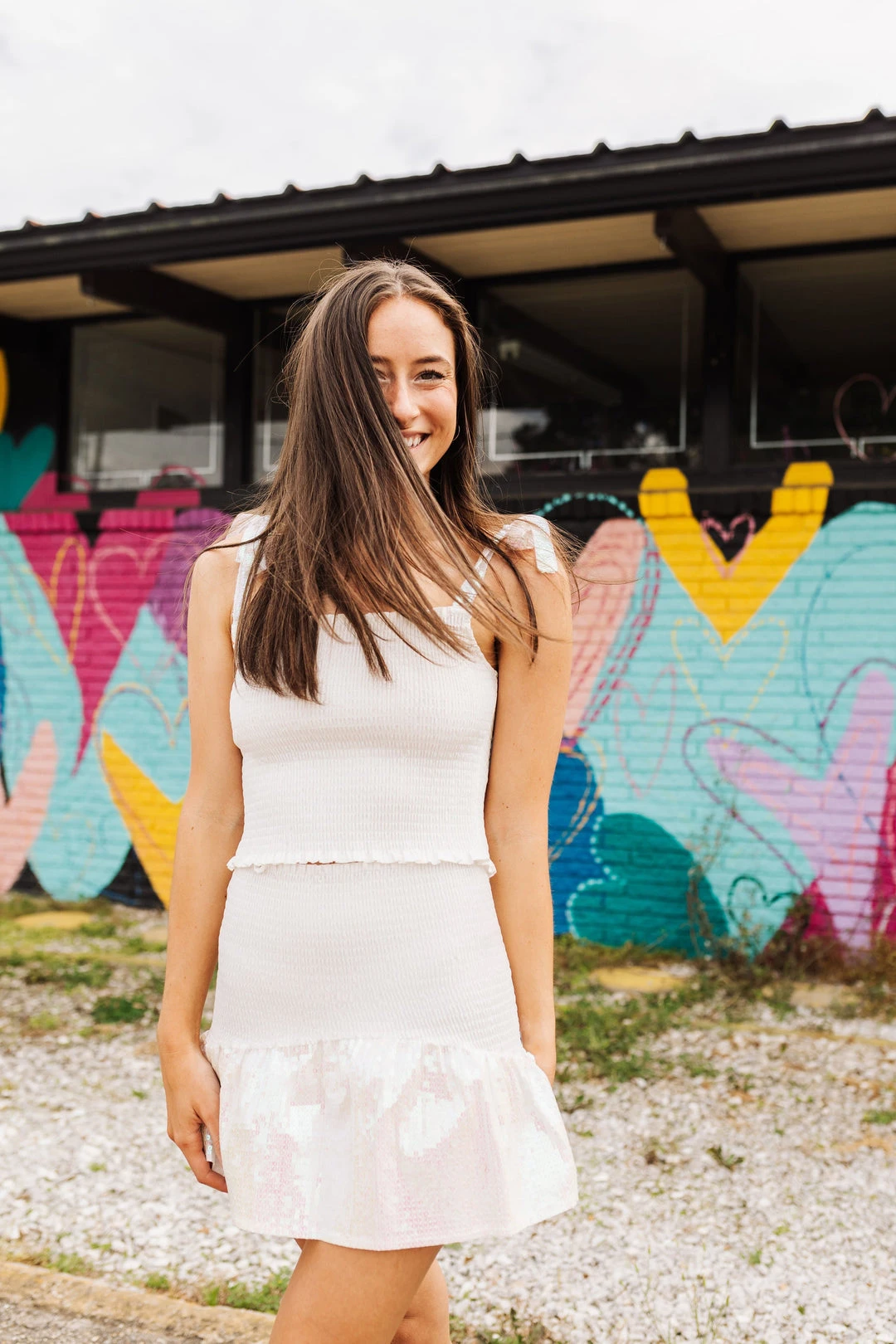 Queen Of Sparkles Spring 2022 White Smocked Sequin Tie Tank
