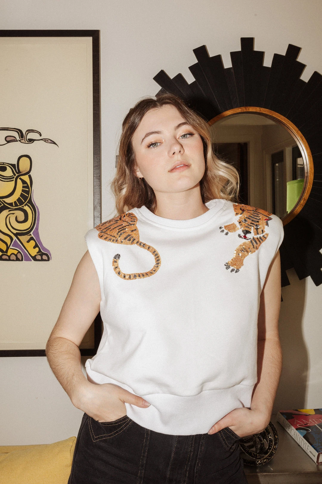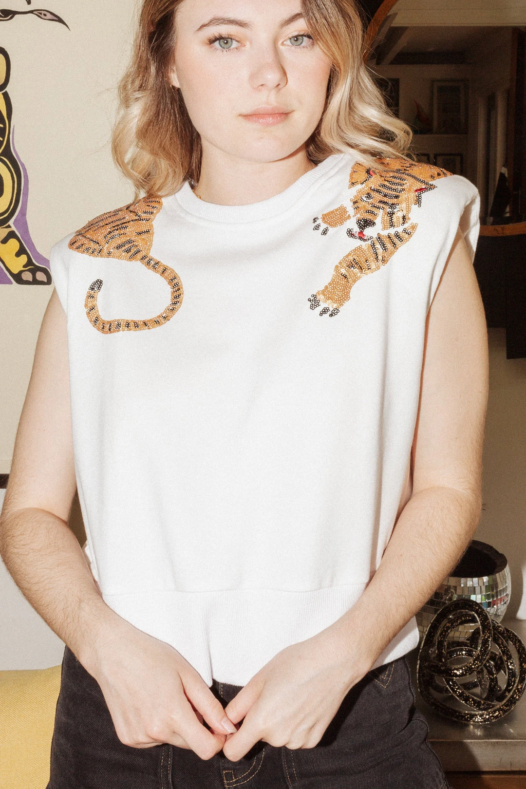 Regular style sweatshirt tank with shoulder pads. Slightly cropped. High waist style shorts. All sweatshirts and shorts fit true to size!