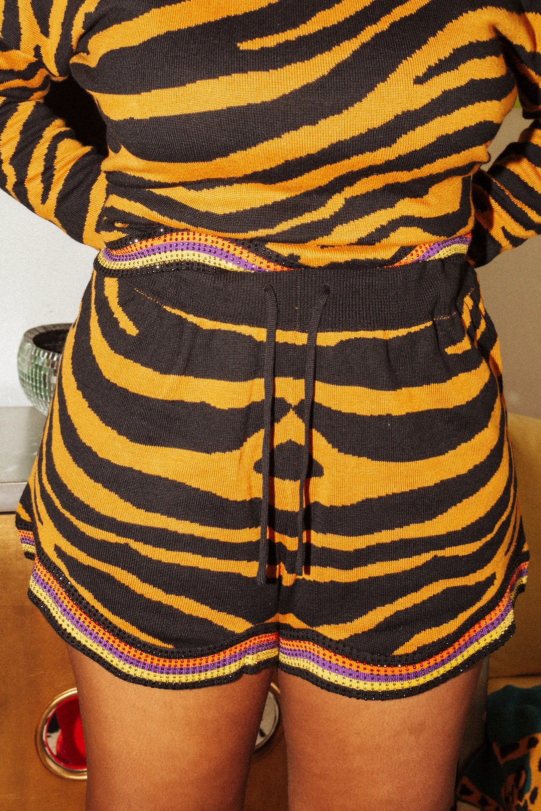 Sweater top with jeweled embellishment. High waist style shorts also with jewel embellishment. All sweaters and shorts fit true to size. Roll the shorts for a shorter fit!